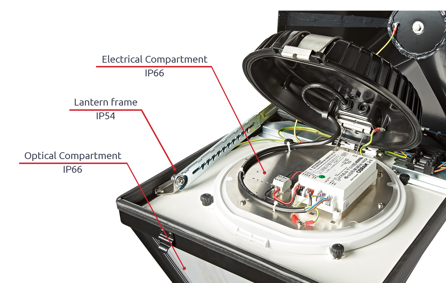 To ensure the integrity of our lanterns our team have designed our very own trademarked clamp system known as ClampPD®, thanks to the use of the compression rubber gasket we are able to achieve an industry leading rating of IP66 in both the gear and optical compartments across our lanterns and retrofit optics.